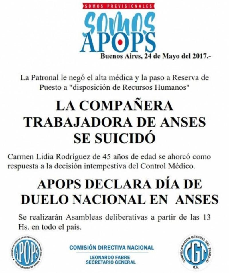 La trabajadora estaba de licencia y le negaron el alta. La misma había pasado a disposición de Recursos Humanos. Desde la Asociación del Personal de Organismos de Previsión Social declararon duelo nacional y realizarán asambleas en sus puestos de trabajo.