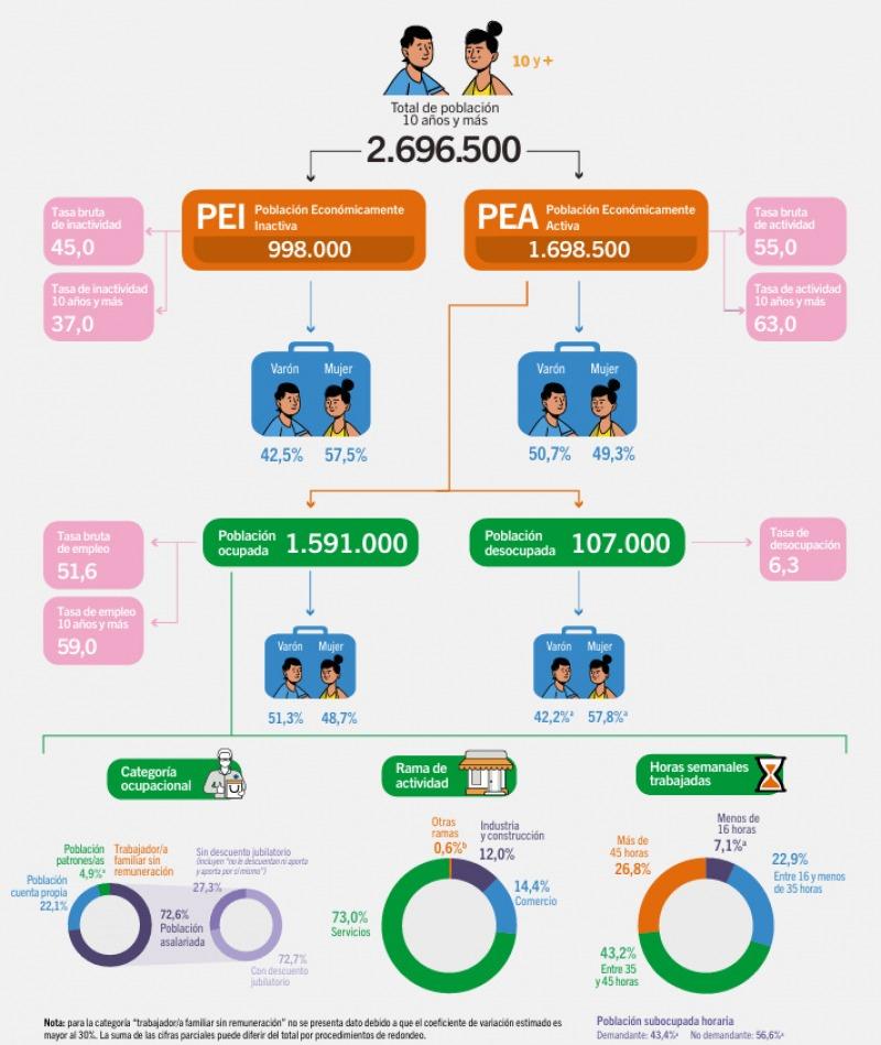 En cuanto a la estructura del empleo, el 73% de los puestos de trabajo se concentra en el sector Servicios, seguido por Comercio (14,4%) e Industria y construcción (12,0%). La subocupación horaria afecta al 8,2% de la población activa y mostró una caída interanual de 1,9 puntos porcentuales; sin embargo, el 56,6% de las personas subocupadas no demanda más horas de trabajo.