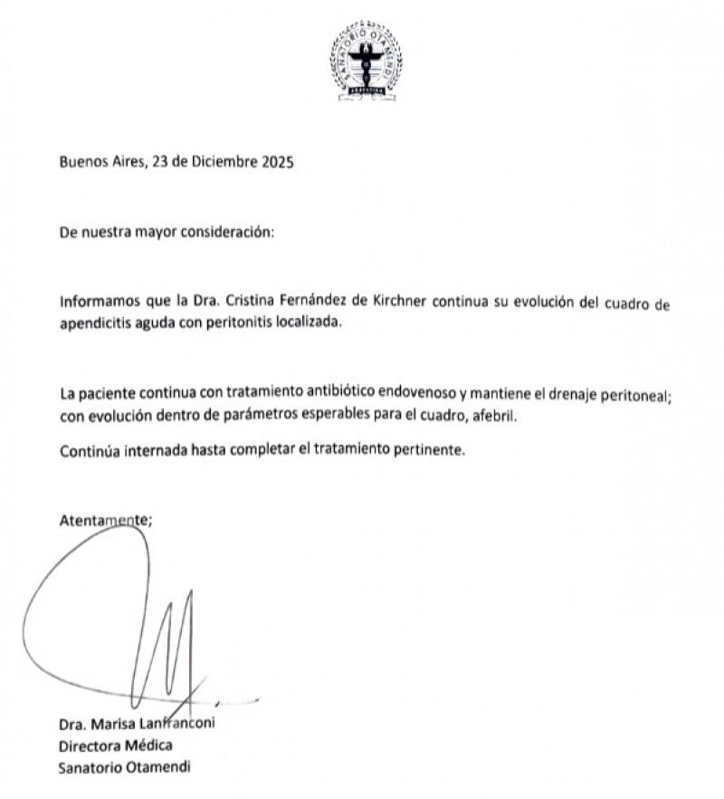 La ex presidenta Cristina Fernández de Kirchner permanece internada desde el fin de semana en el Sanatorio Otamendi, en la Ciudad de Buenos Aires, a raíz de un cuadro de apendicitis aguda con peritonitis localizada. Así lo informó el último parte médico difundido este martes, en el que se indicó que continúa bajo tratamiento antibiótico endovenoso y con drenaje peritoneal, por lo que seguirá hospitalizada hasta completar el tratamiento correspondiente.