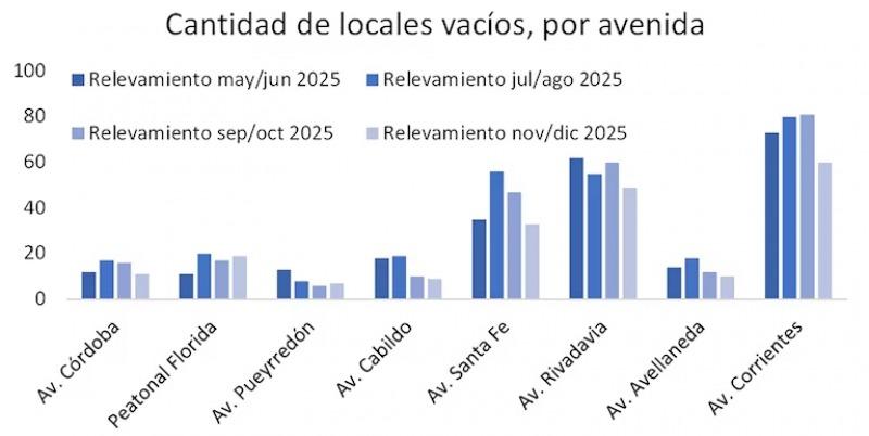 El relevamiento que realizó la Cámara Argentina de Comercio y Servicios (CAC) mostró que la cantidad de comercios vacíos aumentaron 26,9% en el bimestre noviembre-diciembre de 2025 respecto del mismo período en 2024. Se contabilizaron 198 locales en venta, alquiler o cerrados en las principales avenidas de la Ciudad. En comparación con el bimestre septiembre - octubre de 2025 hubo una baja del 20,5% que representaba 249 inmuebles.