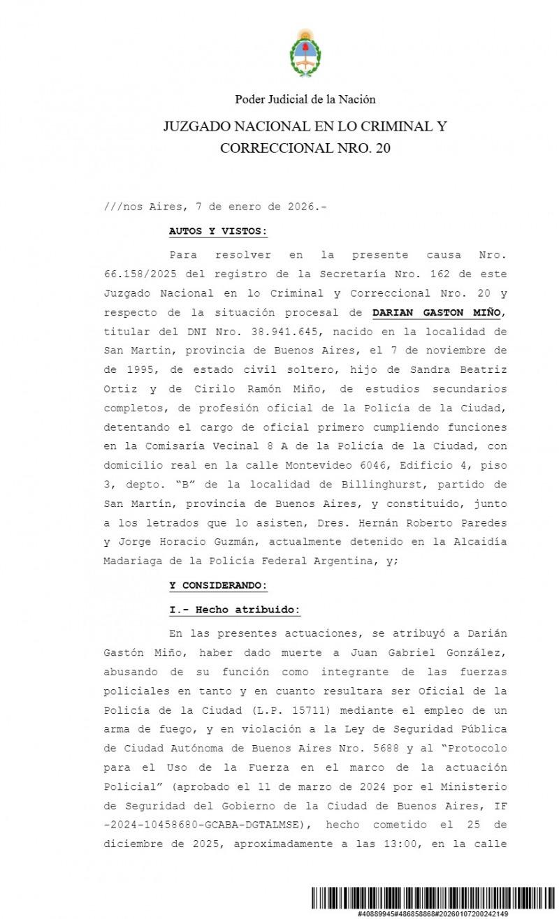 El oficial de la Policía de la Ciudad acusado de haber asesinado a Juan Gabriel González, un vecino de Villa Lugano de 45 años, fue procesado con prisión preventiva por el delito de homicidio agravado por pertenecer a una fuerza de seguridad. La resolución fue dictada por el juez Hugo Decaría, titular del Juzgado Nacional en lo Criminal y Correccional N.º 20, quien consideró que "los elementos de prueba incorporados hasta el momento acreditan la materialidad y participación del imputado" en el procedimiento que terminó con la muerte del hombre el 25 de diciembre pasado.