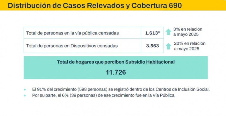 Según los datos oficiales, 1.613 personas fueron registradas durmiendo en la calle, lo que representó un aumento del 3% en comparación con mayo de 2025. A ese número se sumaron 3.563 personas alojadas en distintos dispositivos de contención, principalmente en los Centros de Inclusión Social (CIS), lo que implicó un crecimiento del 20% respecto de la medición anterior.