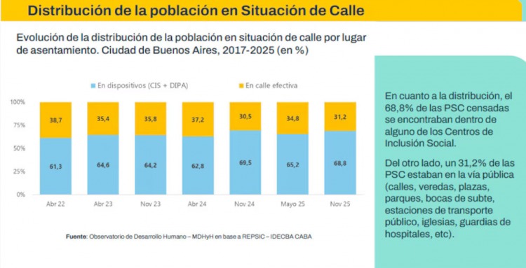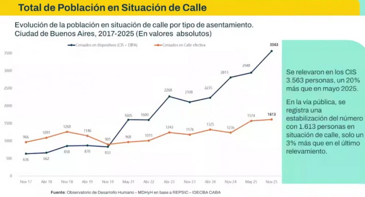 El último Relevamiento de Personas en Situación de Calle realizado por el Gobierno de la Ciudad de Buenos Aires en noviembre de 2025 confirmó un incremento en la cantidad total de personas que atraviesan esta situación, tanto en la vía pública como en dispositivos de alojamiento, en un contexto marcado por la crisis económica y la fragilidad de los vínculos sociales.
