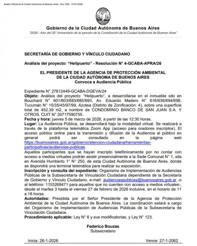 La Agencia de Protección Ambiental (APRA) de la Ciudad Autónoma de Buenos Aires convocó a una Audiencia Pública para evaluar el proyecto denominado “helipuerto”, que planea la construccion en un inmueble ubicado en pleno microcentro porteño. La convocatoria fue oficializada mediante la Resolución Nº 4-2026-GCABA-APRA, en el marco del Expediente Nº 27812449-GCABA-DGEVA/2.