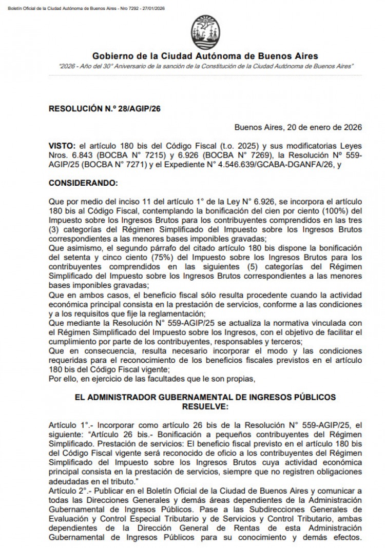 La Ciudad de Buenos Aires puso en vigencia un nuevo beneficio fiscal fiscal destinado a pequeños contribuyentes del Impuesto sobre los Ingresos Brutos inscriptos en el Régimen Simplificado y su actividad principal debe estar vinculada a la prestación de servicios. La medida fue oficializada por la Administración Gubernamental de Ingresos Públicos (AGIP) mediante la Resolución N.º 28/AGIP/26 y ya se encuentra en aplicación.