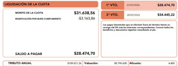 Para 2026 se mantienen distintas modalidades de pago con descuentos. El pago anual anticipado otorga un 10% de bonificación, mientras que quienes hayan cumplido en término con todas las cuotas de 2025 acceden a otro 10% por buen cumplimiento. Además, adherir al débito automático antes del 30 de abril permite obtener una bonificación anual del 8,33%, aplicada en la última cuota.