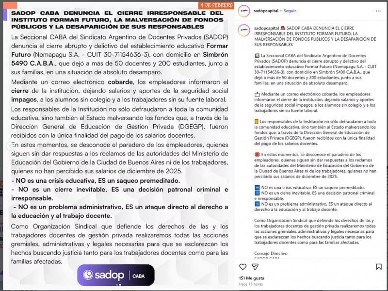 Según denunciaron Sadop y la Asociación de Institutos de Enseñanza Privada de Argentina (AIEPA) , quedaron sueldos y aportes impagos y los representantes legales “desaparecieron”, fue un cierre "abrupto y delictivo", caracterizaron.