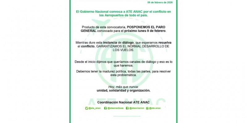 La Asociación Trabajadores del Estado (ATE) anunció la suspensión del paro de actividades en la Administración Nacional de Aviación Civil (ANAC) que estaba previsto para el lunes 9 de febrero, por lo que los vuelos operarán con normalidad en el inicio de la semana.