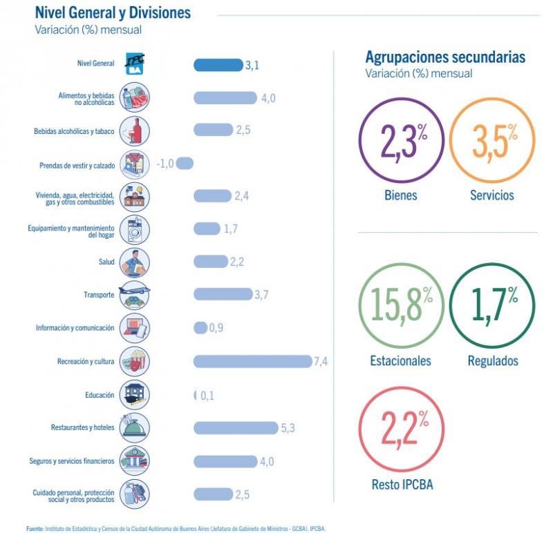 La división de Vivienda, agua, electricidad, gas y otros registró un incremento mensual del 2,4%. En contraste, Prendas de vestir y calzado fue el único rubro con variación negativa, con una baja cercana al 0,1%, explicada en parte por las liquidaciones y el bajo nivel de consumo.