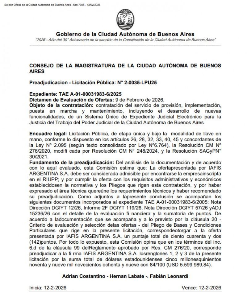 En ese contexto, el Consejo de la Magistratura emitió el dictamen de evaluación de ofertas correspondiente a la Licitación Pública N° 35/CMCABA/25, destinada a la contratación de un Sistema Único de Expediente Judicial Electrónico para la Justicia del Trabajo. La contratación contempla la provisión, implementación, puesta en marcha y mantenimiento del sistema, así como el desarrollo de nuevas funcionalidades.