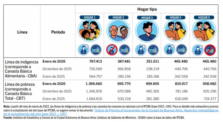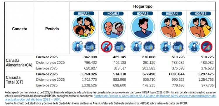 El estudio toma como modelo un hogar integrado por una pareja de 35 años, ambos con empleo y propietarios de su vivienda, y dos hijos de 9 y 6 años. Para ese grupo familiar, la línea de pobreza, marcada por la Canasta Básica Total (CBT), se ubicó en $1.396.660 durante el primer mes del año. En tanto, la línea de indigencia, definida por la Canasta Básica Alimentaria (CBA), alcanzó los $767.413.