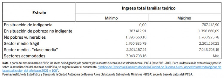 Por encima de la pobreza, la metodología porteña diferencia entre sectores medios “frágiles” y “clase media”. El primer grupo incluye a quienes cubren la canasta total pero no superan en más de 25% ese monto. La clase media consolidada, en tanto, está compuesta por hogares con ingresos superiores a ese adicional, aunque sin llegar a cuadruplicar el valor de la CBT. El límite con los sectores acomodados se establece en torno a los 7 millones mensuales.
